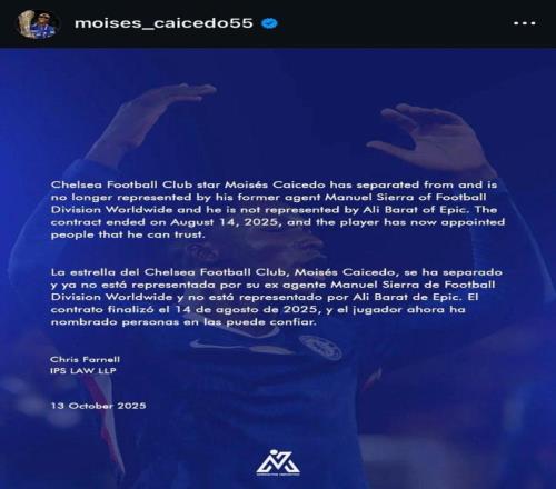 这是他长期的计划,在通过两家经纪公司分别转会至布莱顿和切尔西后,他决定实施这一方案,之前的帖子因措辞不当已删除,但他对之前的经纪人并无恶意。