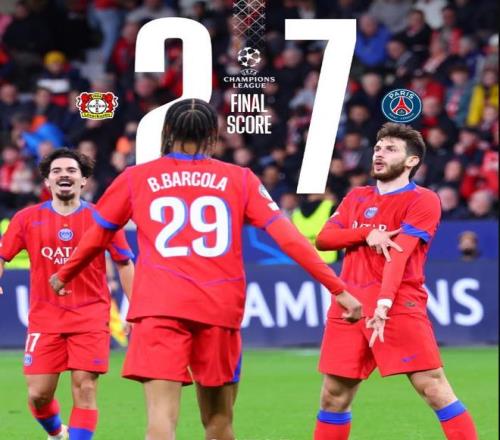 雷速体育10月22报道 北京时间今天凌晨,欧冠联赛阶段第三轮,巴黎圣日耳曼客场7-2大胜勒沃库森。