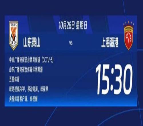 北京时间10月26日下午15:30,中超联赛第28轮将迎来一场强强对话,山东泰山坐镇主场迎战上海海港。央视体育频道CCTV-5、山东广播电视台体育休闲频道、五星体育将进行现场直播,球迷也可通过咪咕视频APP、移动高清、咪视界、央视体育客户端、央视频等网络平台观赛。