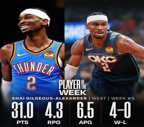 亚历山大在上周场均可以得到31.0分4.3个篮板6.5次助攻的数据,带领雷霆队取得了4胜0负的战绩。目前雷霆队在联盟一骑绝尘,球队已经取得了一波9连胜的战绩,总战绩来到了17胜1负。
